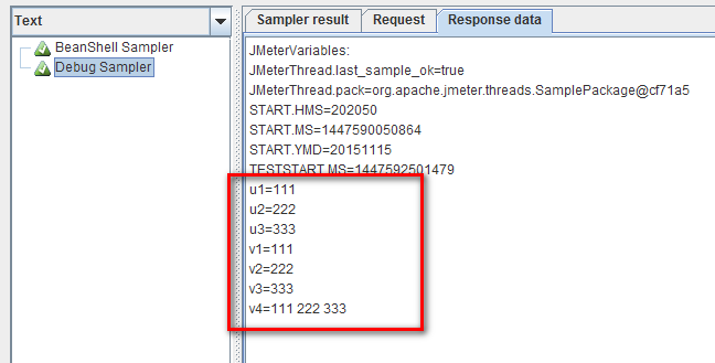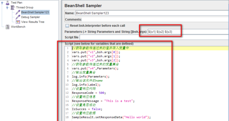 a、bean shell可以接受传入参数,如下图:${u1} ${u2} ${u3}