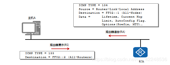 网络节点向相连的路由器发送RS,请求地址前缀信息。 路由器通过发送路由器通告RA,回复地址前缀信息。