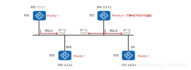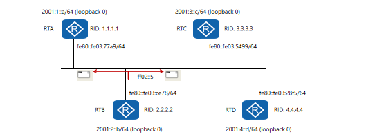 (3)IPv6使用组播地址FF02::6表示AllDRouters,而OSPFv2中使用的是组播地址224.0.0.6。