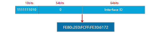 (2)链路本地单播地址的前缀为FE80::/10,表示地址最高10位值为1111111010。前缀后面紧跟的64位是接口标识,这64位已足够主机接口使用,因而链路本地单播地址的剩余54位为0。