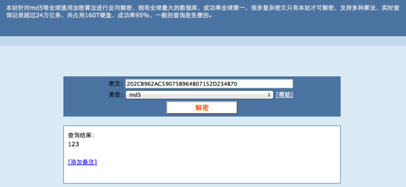 (1)直接使用MD5加密(去MD5解密网站即可破解)