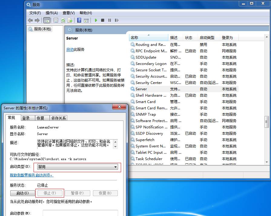 根据首字母排序找到Server服务,双击,选择“警用”和“停止”。