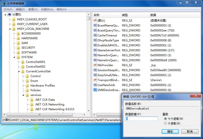 确定后定位到 HKEY_LOCAL_MACHINESYSTEMCurrentControlSetServi cesNetBTParameters 路径,新建名为“SMBDeviceEnabled”的DWORD值,并将其设置为 0