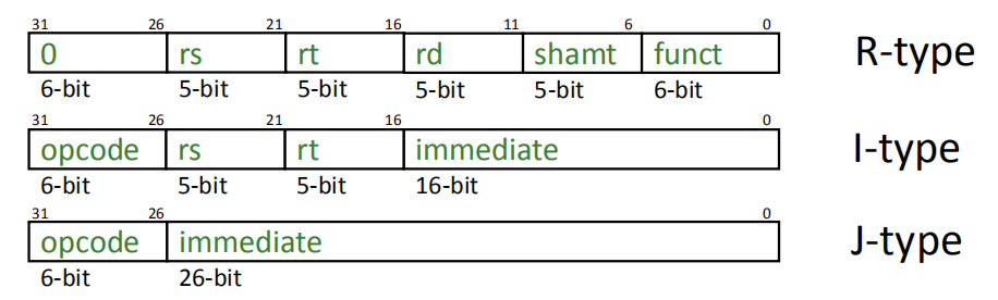 MIPS指令集是RISC精简指令集,拥有RISC的特点,首先其中的所有的指令位数都是32位的,在这32位中有6为用于编码操作种类,所以我们很容易就了解到,它最多有2的6次方条指令(0 ~ 63)共64条。之后的26位根据划分的不同分为I类,R类和J类。其中所有的寄存器引索都是以5为来编码(0 ~ 31其中0号比较特别,它始终是数字0)。
