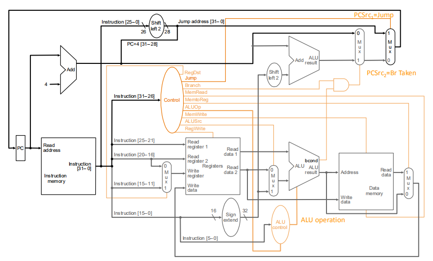分支指令:if (cond) PC ←ALU else PC←NPC(这个NPC是计算后的PC也就是分支的地址如上图,cond是上面计算的判断条件)
