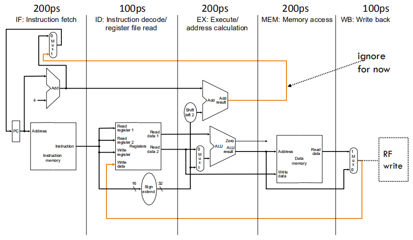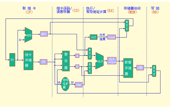 这个数据通路的操作分成5个时钟周期,每个时钟周期有相应的操作:取指令,指令译码/读寄存器,执行/有效地址计算,存储器访问/分支完成,写回。
