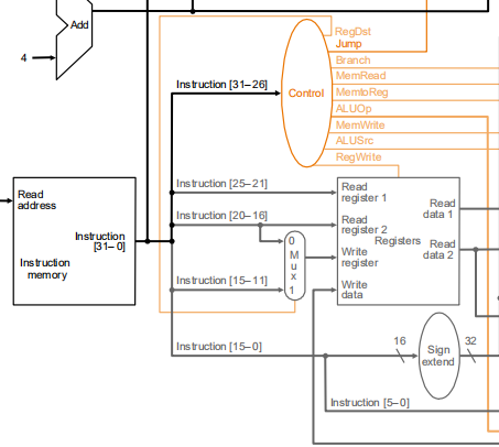 其返回的RegDest作为选通信号,阻断了对[15:11]的传输,将末十六位传到了sign extend位扩展器将16位变成32位(带符号)。ALUSrc传下来选通立即数对ALU的输入,结果完成后返回writeData写回。