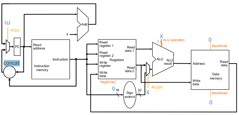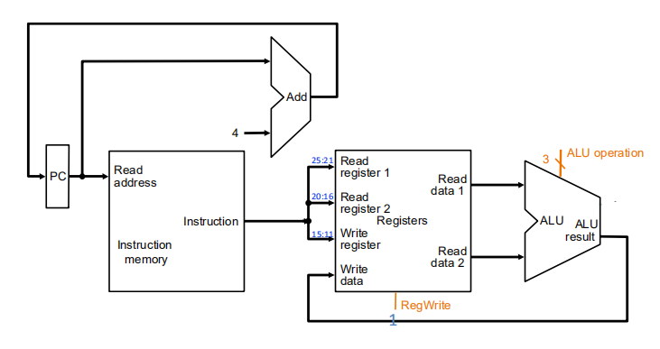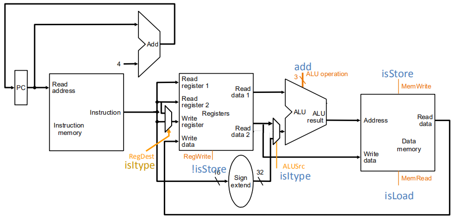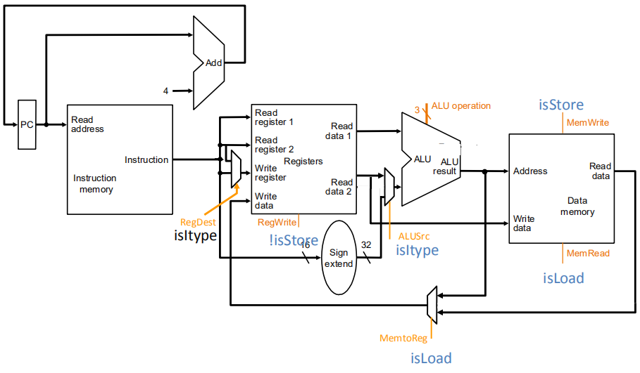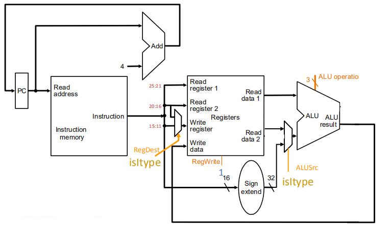 结合上面Addi的数据通路有以下的硬件图(不含控制指令)