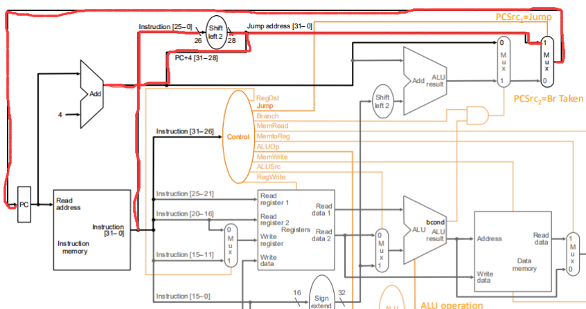 如红线标注的部分指令,指令的[0:25]位取出之后左移两位,之后取出PC的高4位合并为32位传回PC(选通信号由control发出)