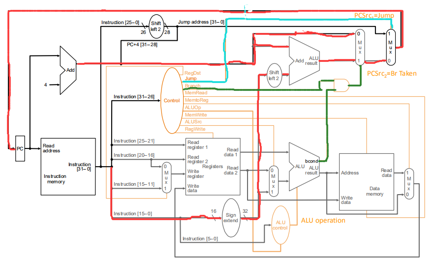 这个数据通路如上图,按执行的顺序来,首先[0:15]位的立即数含符号扩展至32位左移2位,之后与加4之后的PC进行加法运算,同时加4后的PC也准备好了一起进入选通器(红色部分),r传入的两个寄存器进行逻辑运算产生的cond与control的分支信号进行与运算(通过与门)作为选通信号来决定是PC加4作为下一条指令地址还是分支地址(绿色),最终通过一个选通器(用于分别Jmp指令)传回PC(蓝色)。