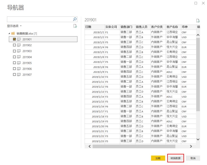 选择需要处理的Excel文件,将看到多个工作表,随便选择其中的一张,然后单击转换数据。