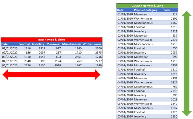 为了在上面添加一些细节,在将数据提取到Power BI中时,该过程将通过Power Query进行任何数据整形和数据转换操作,然后将数据加载到Power Pivot中,该数据是一个压缩的列式数据库,用于存储数据通过VertiPaq引擎存储在内存中。现在,我们不打算详细介绍VertiPaq引擎,但是要摆脱这一点非常重要的一件事是,VertiPaq引擎是列式存储引擎,因此可以压缩列。出于这个原因,我们应该更加注意我们要摄取的列数,而不是行数。这在下图中突出显示,我们最好少列多行。