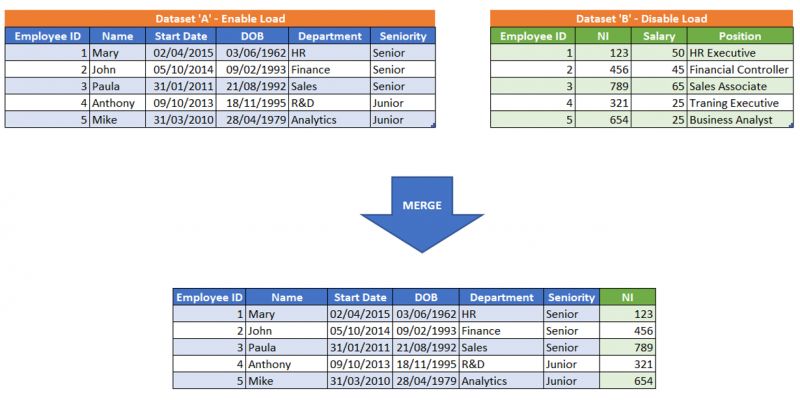 例如,你已经将包含所有员工详细信息的数据集“ A”摄取到Power BI中,但是,对于必须执行的分析,需要“ NI”列,该列存储在名为数据集“ B”的另一源中。因此,数据集“ B”也被加载到Power BI中,仅用于与数据集“ A”进行合并,并派生列“ NI”。