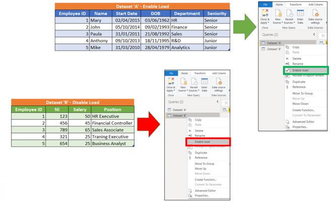 完成此操作后,通常可以将数据集“ A”和数据集“ B”都加载到Power Pivot中。请停止这步习惯性的操作吧!我们应该右键单击数据集“ B”,然后取消选择“启用负载”,这将禁用Power Query将该查询加载到Power Pivot中,因此不会不必要地消耗内存。