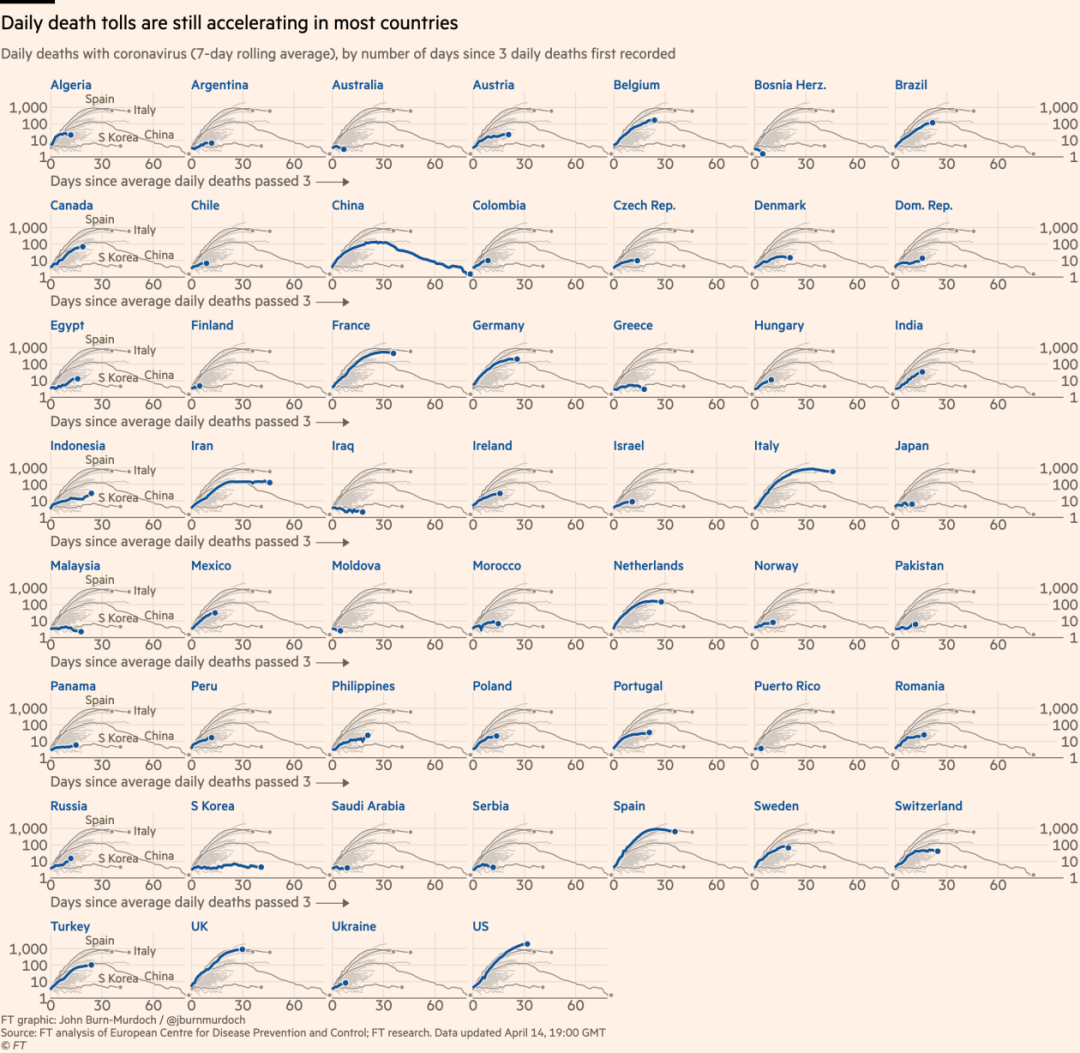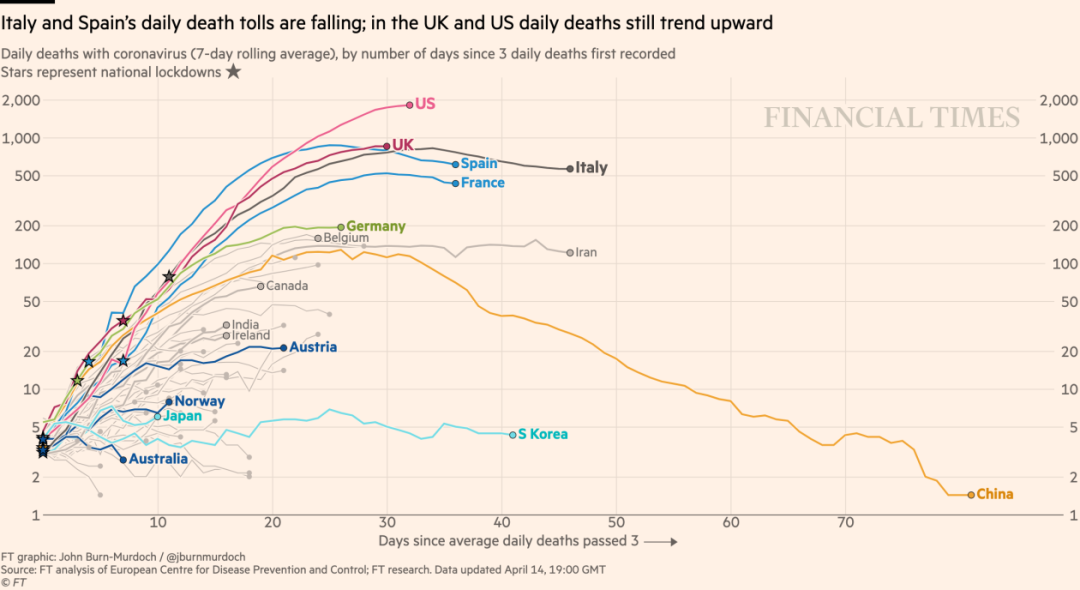 3月初,欧洲成为冠状病毒的焦点,当时该病在整个非洲大陆迅速蔓延。意大利很快成为继中国之后受Covid-19打击最严重的国家。经过数周的严格封锁之后,意大利濒临拐弯,死亡人数开始下降。但是,美国仍处于加速阶段。