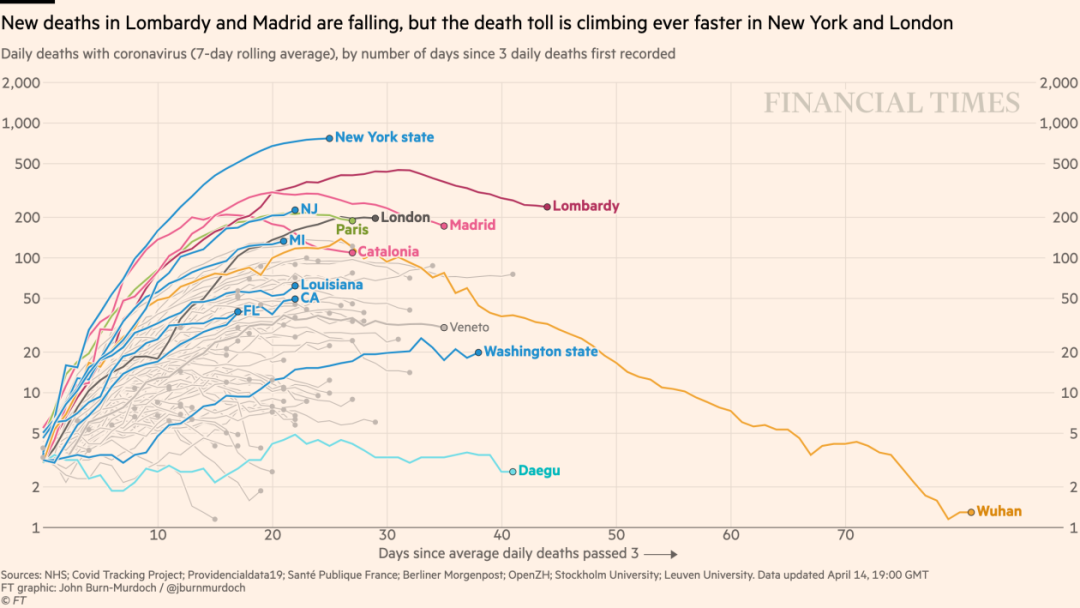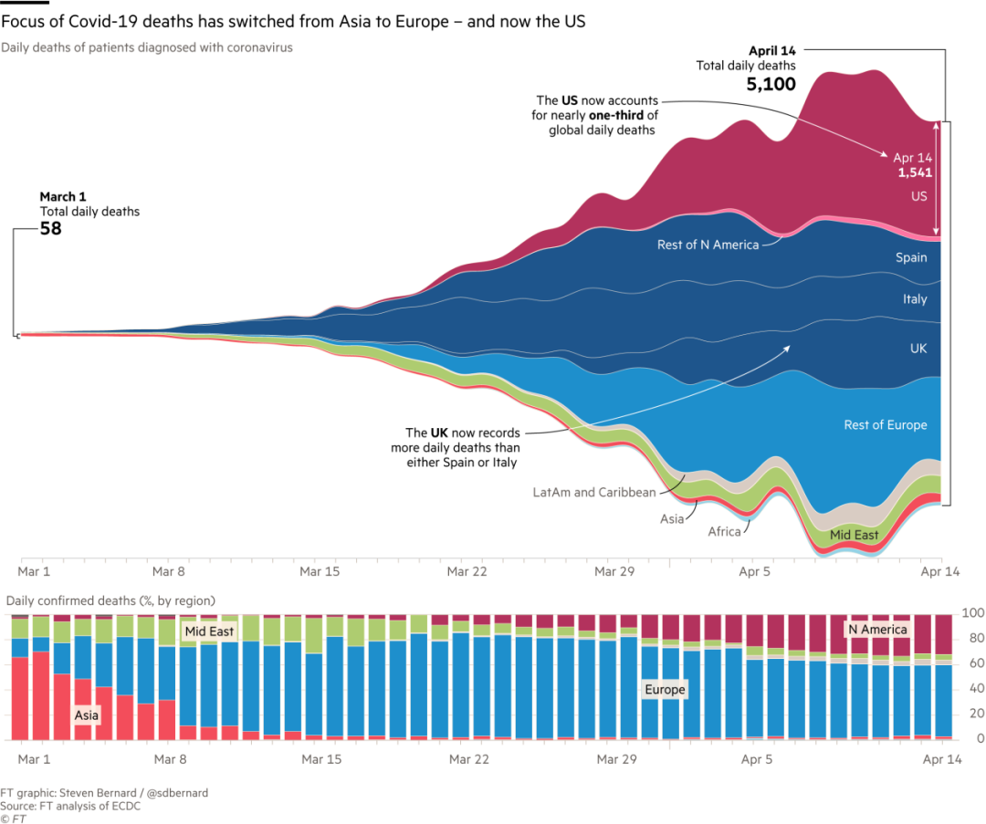 3月初,亚洲占冠状病毒相关死亡的60%以上。一周之内,注意力转移到了欧洲,意大利和西班牙成为了新的全球热点。尽管该地区的死亡人数仍占全球死亡人数的一半以上,但现在的重点已转向美国,美国的死亡人数在最近几天迅速增加。