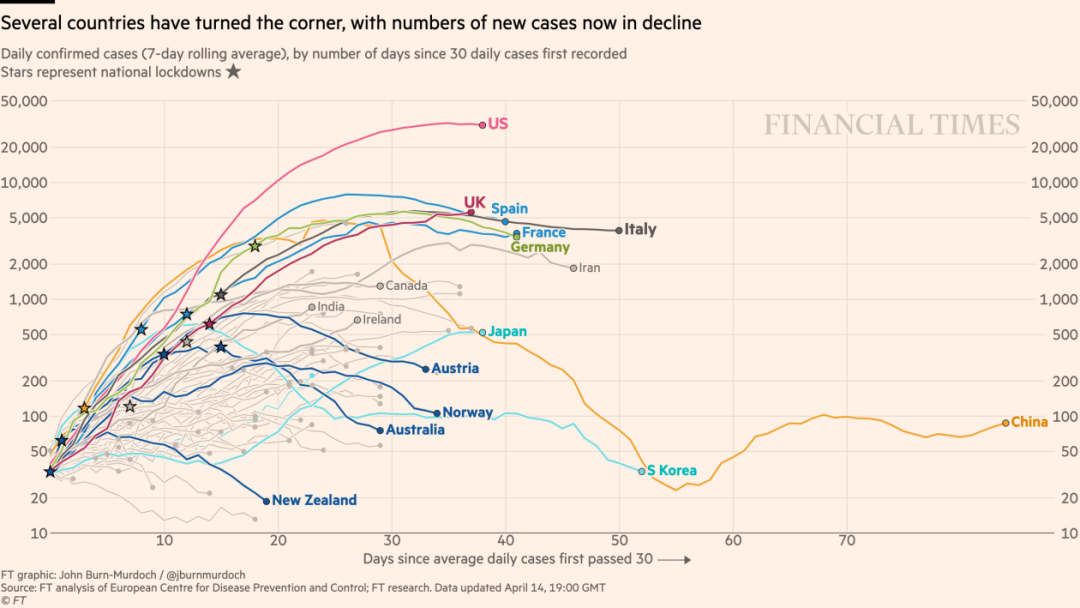 美国现在是全球新病例最多的国家。过去一周的感染总数超过100,000。但是,在某些欧洲国家,新确诊的病例数开始趋于平稳,而在意大利,这一数字开始下降。
