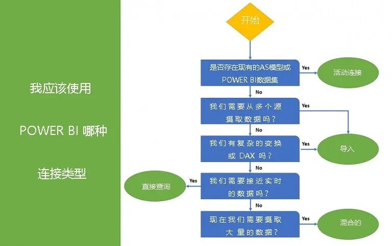现在,我们将不再深入探讨各种连接类型的细节,如果你想要了解一些关于Power BI连接类型,大家可以留言,这里温馨提醒下:简要说明我们应该问自己的问题,以确定哪种连接类型最合适。请记住,这仅是一个指南,因为根据业务环境和报告要求,它可能会发生变化。