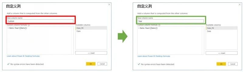 例如,当我们选择“ Custom Colum”来派生一列时,我们还应该利用同时命名该列的优势,而不是生成第二个转换步骤:
