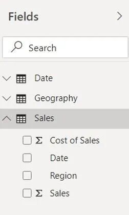 我们进入Power BI Desktop,开始创建可行的,美观的,有价值的分析报告。因此,我们要做的第一件事是将数据提取到Power BI中。完成此操作后,我们将在“字段”窗格中找到我们提取的所有表,如下所示。