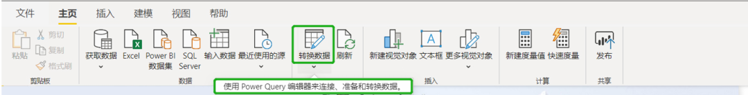Power BI中的数据转换是通过Power Query组件完成的,该组件用于所有数据转换和数据整形操作。对于那些不熟悉Power BI的用户,只需选择Power BI Desktop桌面功能区中的“转换数据”按钮即可轻松访问Power Query,如下所示: