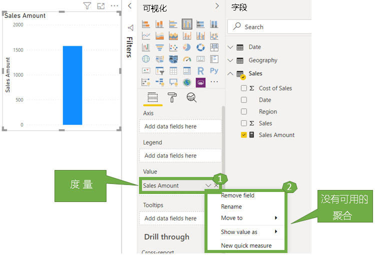 因此,如果我们现在将显式度量“ Sales Amount”拖放到画布上,请注意我们得到的结果与隐式度量相同,但是我们不能再为此度量选择聚合器。