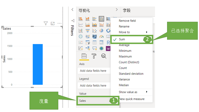 请注意,从上图中可以看到,Sales度量标准自动分配了Sum聚合器,可以将其更改为Average,Maximum,Count等。这就是为什么我们将其称为隐式度量标准的原因,因为我们没有直接说明聚合类型分配,但Power BI默认选择它。