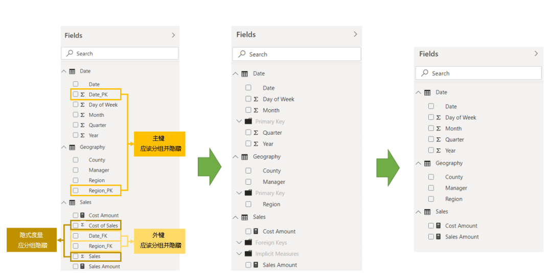 第二个技巧与上面解释的技巧是相辅相成的,因为在我们生成显式度量之后,我们应该如何处理所有剩余的隐式度量?如果它们不可见,它们肯定会使报告作者困惑。此外,如果我们将数据模型构造为星型模式,则每个事实表都将包含一些外键,以与维度(查找)表中的主键,建立关系。那这些列是否应该对所有人可见?