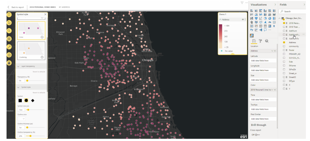 在此版本中,Power BI改进了ArcGIS Maps for Power BI的智能地图功能。智能映射功能会自动分析您的数据并提出数据驱动的样式建议,从而减少您的猜测。现在,有了改进的色带,您可以更清晰地可视化在地图上划分数据的不同类别。您还可以制作更准确的热图,以清楚地标识具有最大属性密度的位置。此外,现在,当您将地址很好地拖到位置字段时,可视化对象会自动检测数据类型并在地图上适当地创建多边形或点。