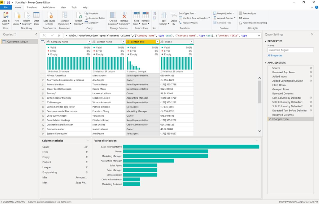 构造完该表后,可以单击“加载/转换”以完成“获取数据”流程。请注意,生成的查询如何包含推断出的所有数据提取步骤的详细细分,这些步骤只是可以根据需要自定义的常规查询步骤。