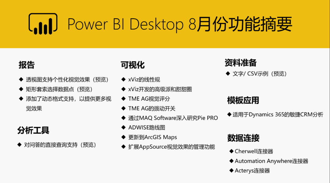 包括对Personalize可视化中的Perspectives的支持,对数据点的矩形选择,对更多可视化的动态格式支持,对Q&A的Direct Query支持,几个新的AppSource可视化等等!查看下文,以了解有关所有更新和增强功能的更多信息。