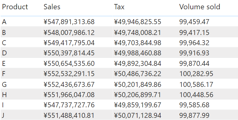此查询不仅速度较慢,而且现在有两个存储引擎查询:一个用于获取Sales数据,另一个用于获取Tax数据。由于需要单独的检测来获取每个度量值,所以在可视化中的度量值越多,或者计算所需的度量值越多,就需要进行更多的检测。这很快就会造成一个很大的性能问题,尤其是每次检测都比较慢的情况下,这种情况更有可能发生,因为度量维度方法意味着Power BI无法有效压缩数据。