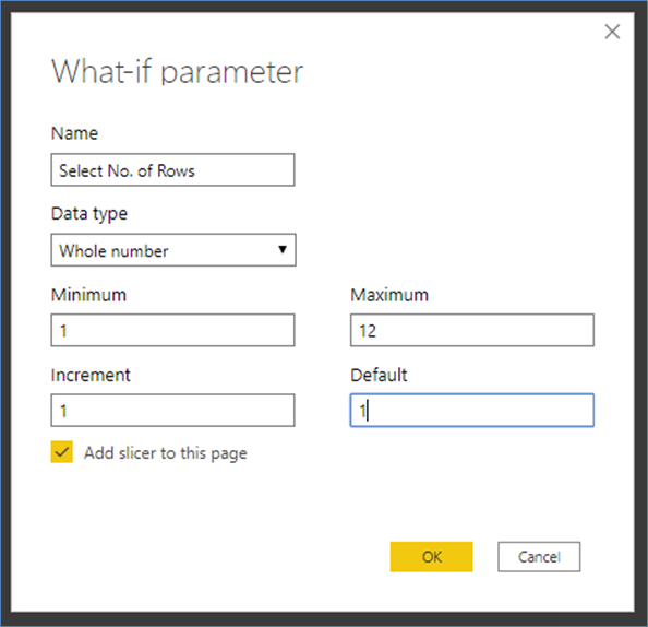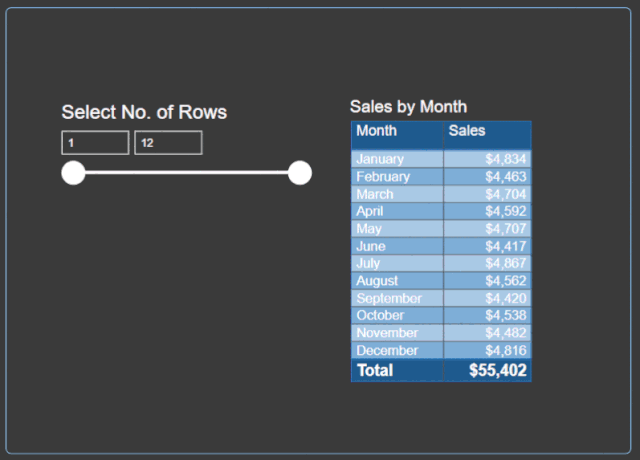 我们在这里取的最大值是12,因为总共有12个日历月。在其他数据量较大的方案中,此值将有所不同,因此,如果数据中有10,000行,则可以将最大值设为10,000。我们也将默认值设置为1,因为当没有输入用户输入时,希望视觉上至少显示一行。也可以将其默认为所有行。
