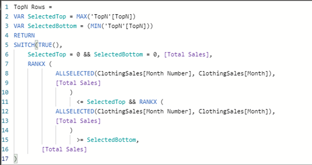 第8行在MONTH列上使用ALLSELECTED函数,因为想获得一个月的总销售额。(还可以添加了月份号,因为我们已使用该列按照数据的时间顺序对MONTH列进行了排序)