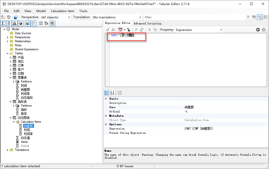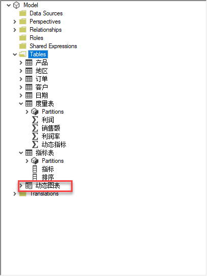 表格编辑器打开,您可以在左面板的“Tables”下看到数据模型中的表。