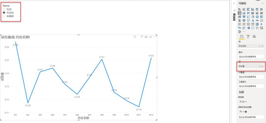 来到Desktop中可以看到一个新的表”动态图表”我们使用动态图表的值来展示信息切片器中放入“name”,在折线图中添加了“动态值”度量。