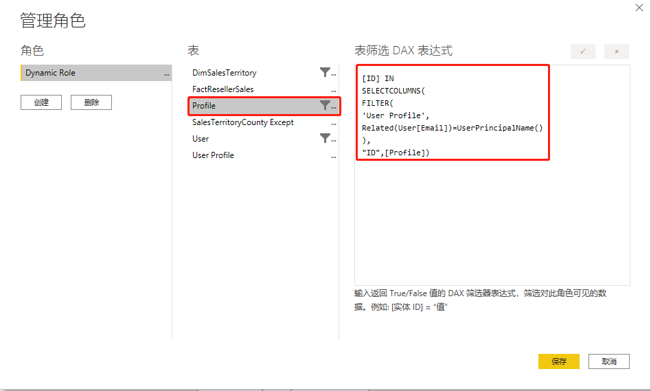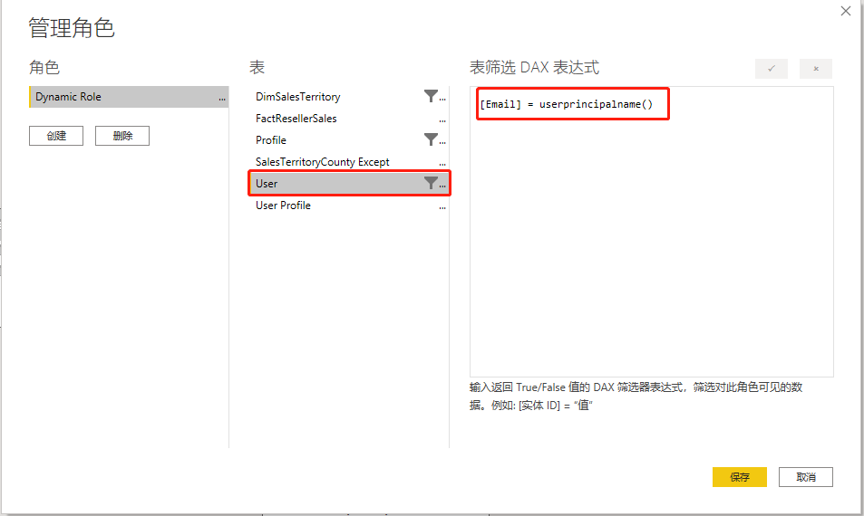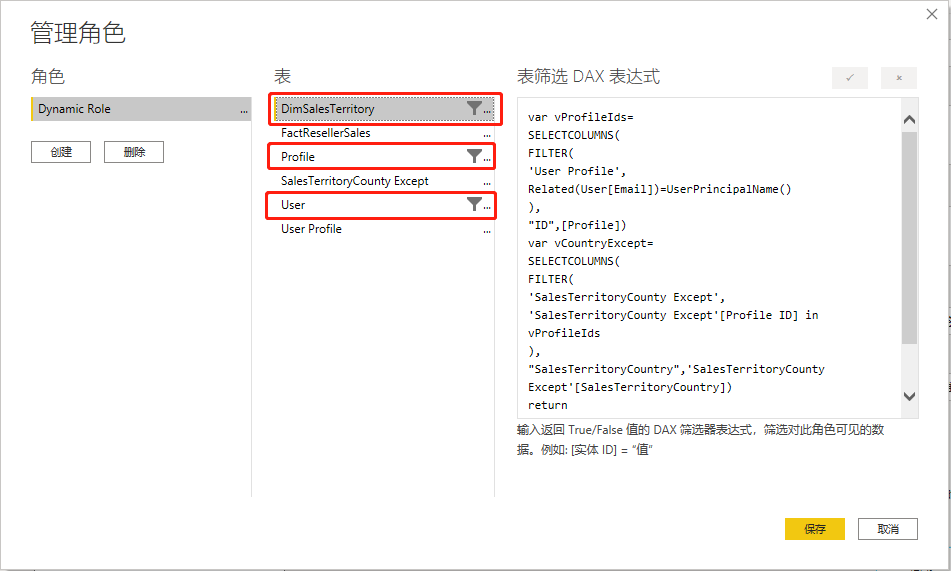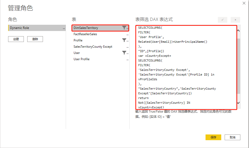 如果我们不使用关系来应用过滤器,则意味着我们需要使用DAX来过滤值。标准将是过滤所有内容,但要过滤来自RLS表的值。如下Power BI中的角色定义将包括以下三个过滤器: