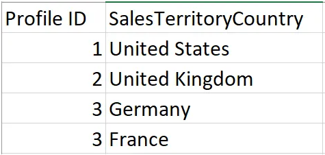 我们有一个用户表,一个配置文件表,并且用户和配置文件表之间的关系是多对多的。我们还有一个名为SalesTerritoryCountry Except的表,其中包含角色不应该包含的国家/地区列表。这是该表中的示例数据,如下: