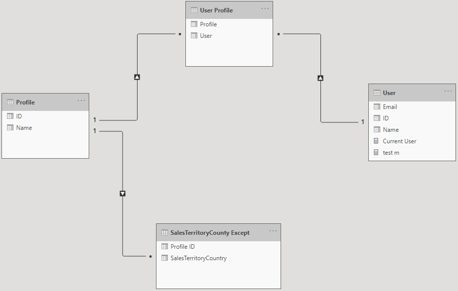 在动态RLS模式中实现Except规则与正常情况有些不同。原因是Power BI中该关系的行为。Power BI中的关系意味着过滤,通过在RLS表和销售模式中的表之间创建关系,我们创建了一种过滤方式,因为我只希望包含这些值。