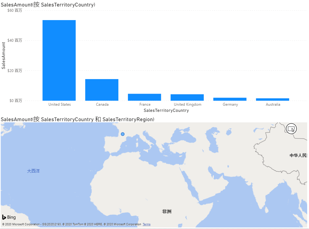 这将导致如下所示的可视化,每个可视化都有每个国家/地区的销售额: