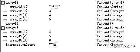 Sub test() Rem>> Rem>> Dim array1() Dim array2() Dim array3() Dim array4() Dim array5() Dim array12() Dim array13() Dim array45() Dim inersectionCount array1 = Array("张三", "李四", 1, 2, 3, 4, 5) array2 = Array("张三", "王五", 3, 4, 5, 6) array3 = Array(11, 12) array4 = Array(1, 2, 3, 4, 5, 6) array5 = Array(4, 5, 6, 7, 8) array12 = funIntersection(array1, array2) array13 = funIntersection(array1, array3) array45 = funIntersection(array4, array5) Err.Clear On Error Resume Next inersectionCount = UBound(array13) If Err.Number <> 0 Then MsgBox "空数组" End If On Error GoTo 0 End Sub