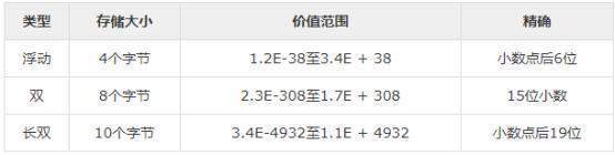 下表提供了具有存储大小和值范围及其精度的标准浮点类型的详细信息