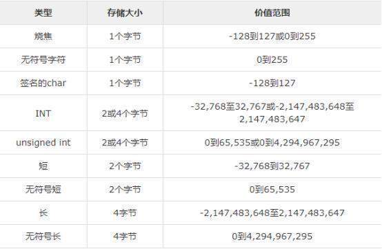 下表提供了标准整数类型及其存储大小和值范围的详细信息