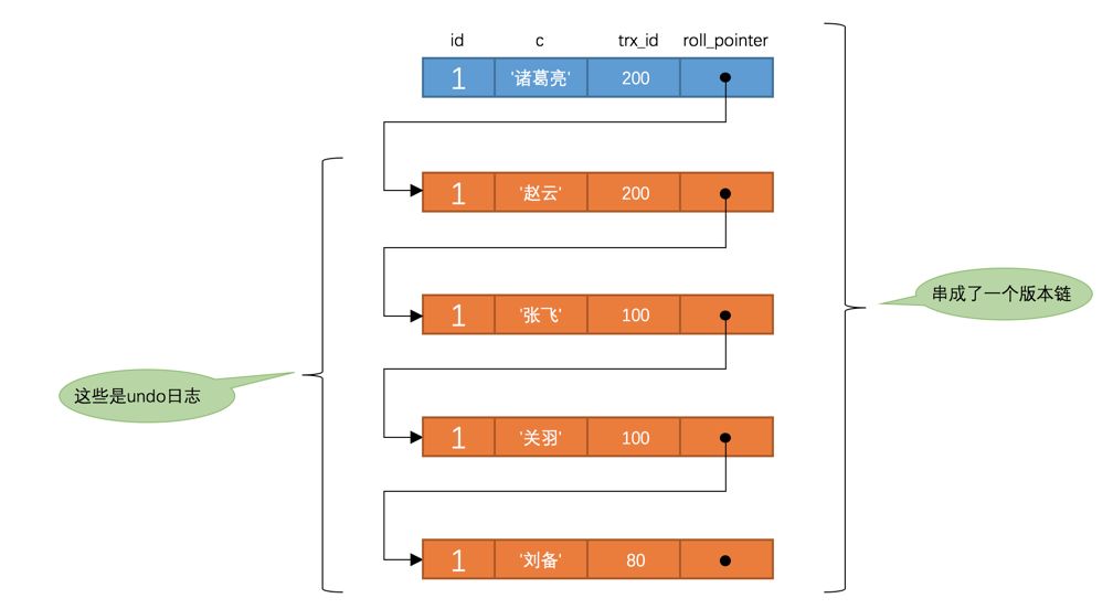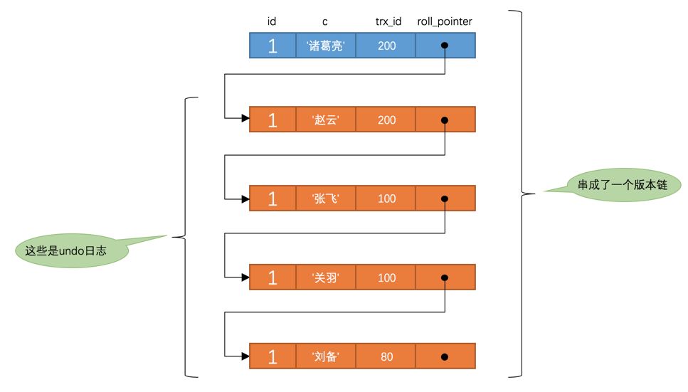 c的内容是'诸葛亮',该版本的trx_id值为200,在m_ids列表内,所以不符合可见性要求,根据roll_pointer跳到下一个版本。 -