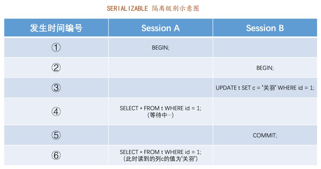 以上3种隔离级别都允许对同一条记录进行读-读、读-写、写-读的并发操作,如果我们不允许读-写、写-读的并发操作,可以使用SERIALIZABLE隔离级别,示意图如下: