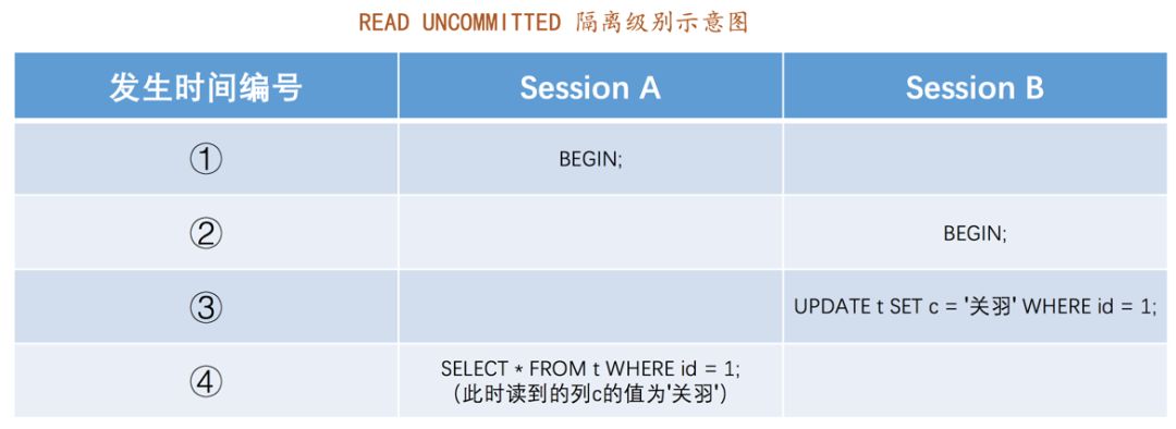 如果一个事务读到了另一个未提交事务修改过的数据,那么这种隔离级别就称之为未提交读(英文名:READ UNCOMMITTED),示意图如下: