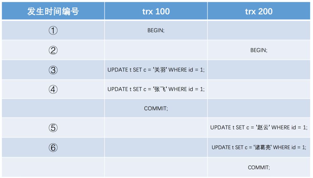 假设之后两个id分别为100、200的事务对这条记录进行UPDATE操作,操作流程如下: