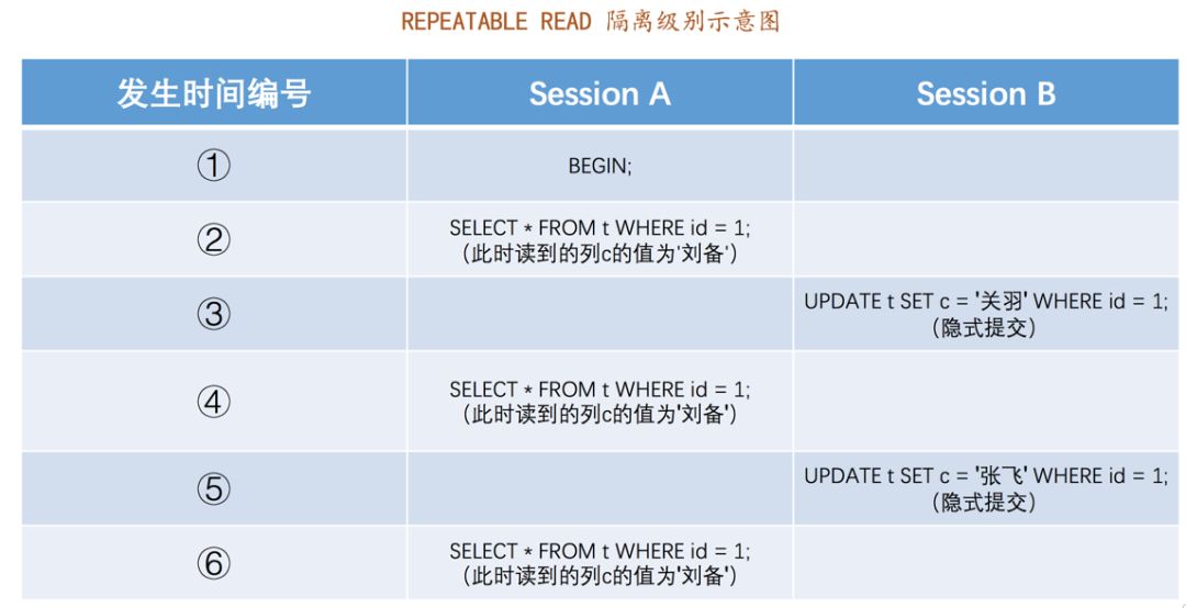 从图中可以看出来,Session A中的事务在第一次读取id为1的记录时,列c的值为'刘备',之后虽然Session B中隐式提交了多个事务,每个事务都修改了这条记录,但是Session A中的事务读到的列c的值仍为'刘备',与第一次读取的值是相同的。