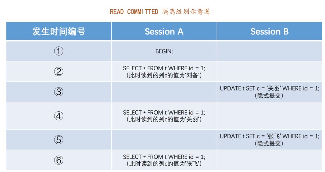 从图中可以看到,第4步时,由于Session B中的事务尚未提交,所以Session A中的事务查询得到的结果只是'刘备',而第6步时,由于Session B中的事务已经提交,所以Session B中的事务查询得到的结果就是'关羽'了。