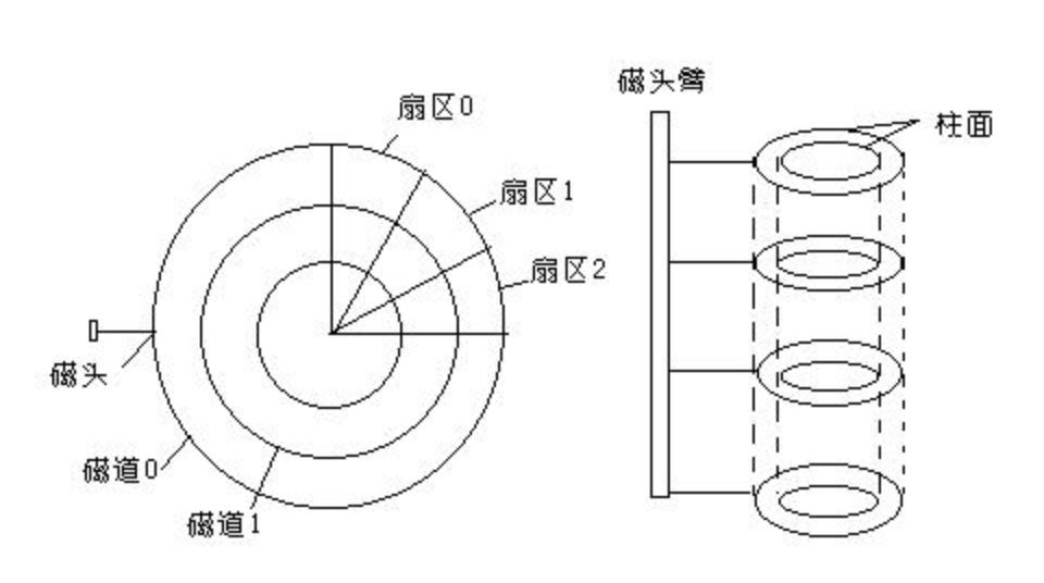 没办法,就是这么蛋疼。在讲这个蛋疼的事情之前,我们还需要再了解一下柱面。柱面指的是所有盘面到主轴距离相等的同心圆的集合。可以参考上图右面的那个示意图,比如图中有4个光盘,8个盘面,那么一个柱面就由8个同心圆磁道构成。